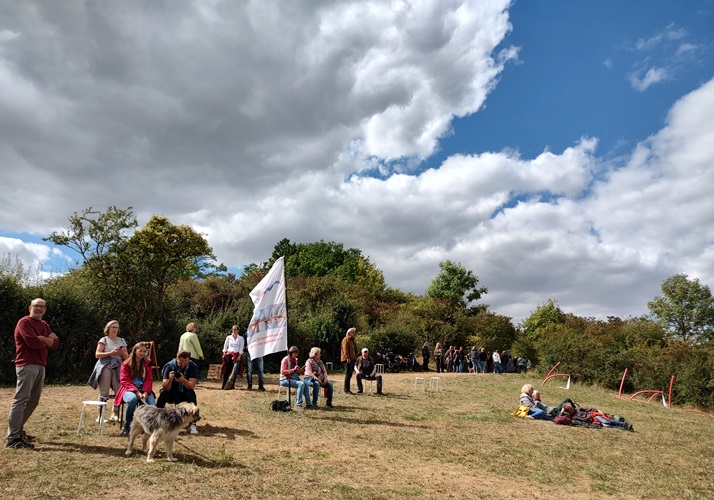 Schon am ersten Ausstellungstag kamen zur Eröffnung hunderte Besuchende auf den Berg mit phänomenalen Weitblicken. Bürgermeister Rüdiger Germeroth , Vizelandrätin Silke Engler und Kuratorin Reta Reinl begrüßten die Gäste und vor allem die anwesenden Künstlerinnen und Künstler. Welf Kerner machte Windmusik und trug mit seinem Akkordeon zu der wunderbaren Sommeratmosphäre bei. Die Künstler stellten sich und ihre Ideen zu fresh vor. Dann ging es zum gemeinsamen Ausstellungsrundgang, bei dem jedes Kunstwerk von der/dem Künstler*in selbst vorgestellt wurde. Eine eindrückliche Vielfalt.