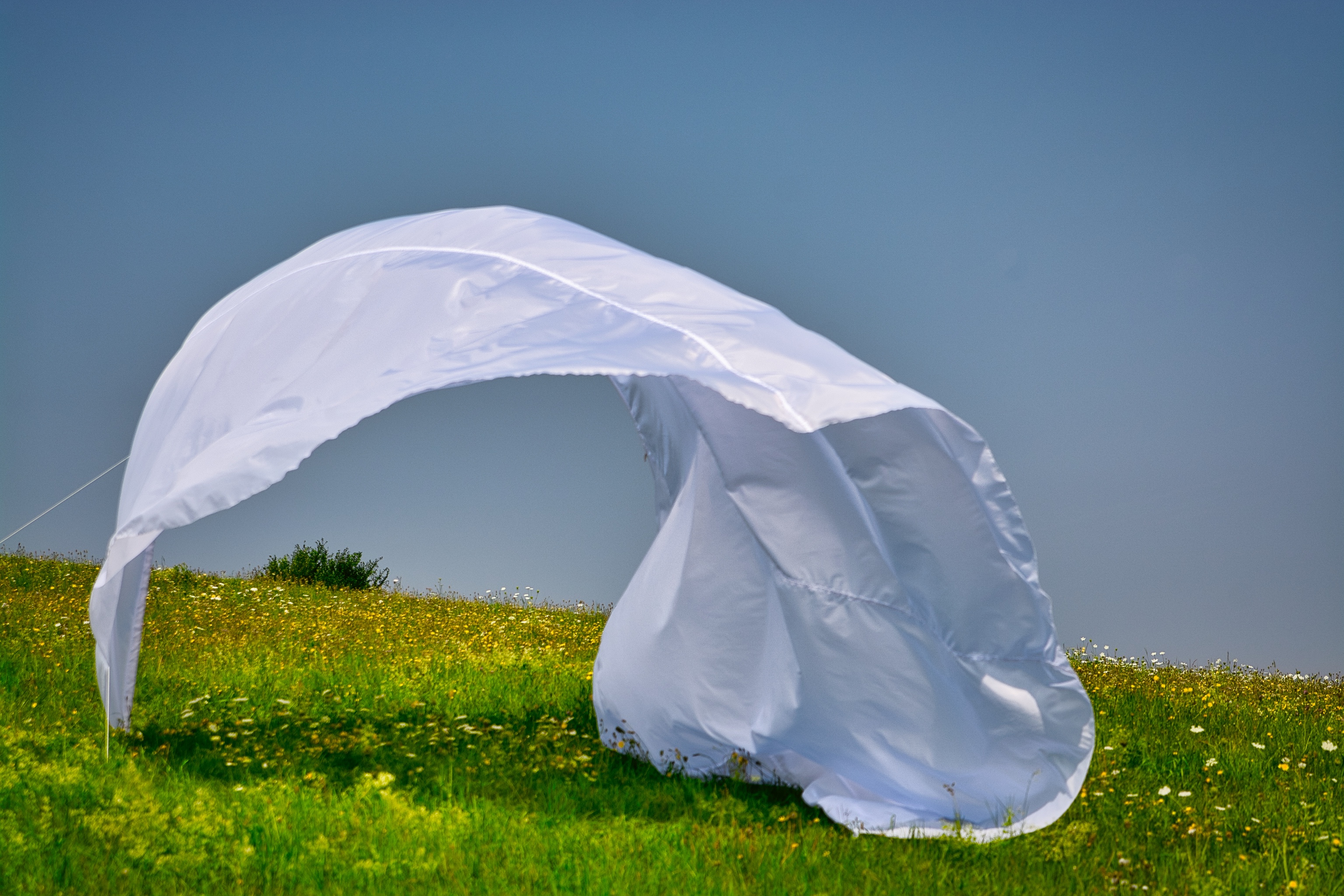 Ein Torbogen hält eine lange weiße Stoffbahn und ist dem Wind ausgesetzt. Man kann das „Haus des Windes“ begehen, wenn der Wind weht. Ohne Wind ist es zu.