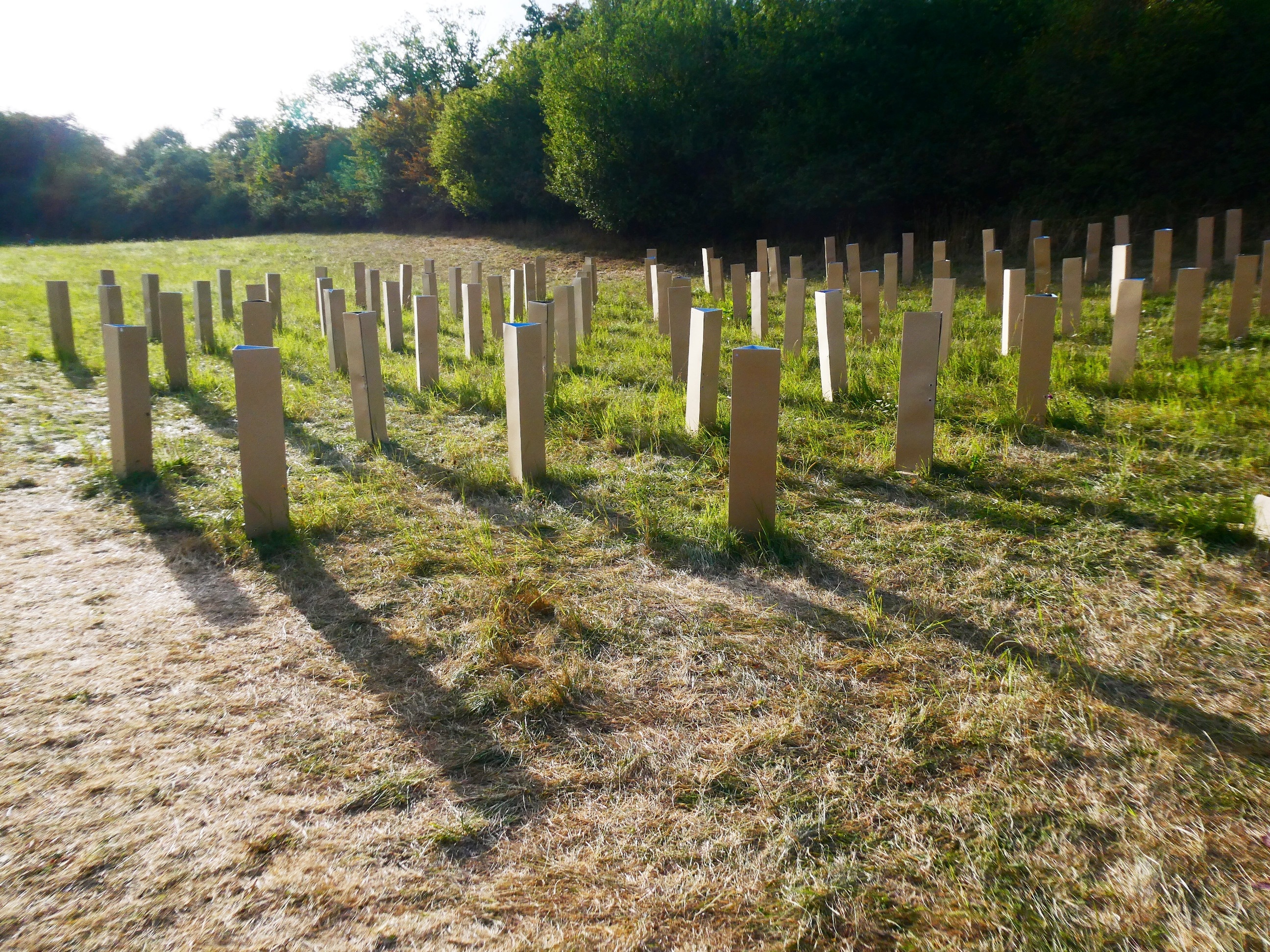 Ein Feld mit 99 dreieckigen braunen Kartonsäulen sieht aus wie eine Aufforstungsfläche. Bei näherer Betrachtung zeigt sich, dass der Künstler Wahlplakate für die Pflanzenschutzsäulen verwendet hat.