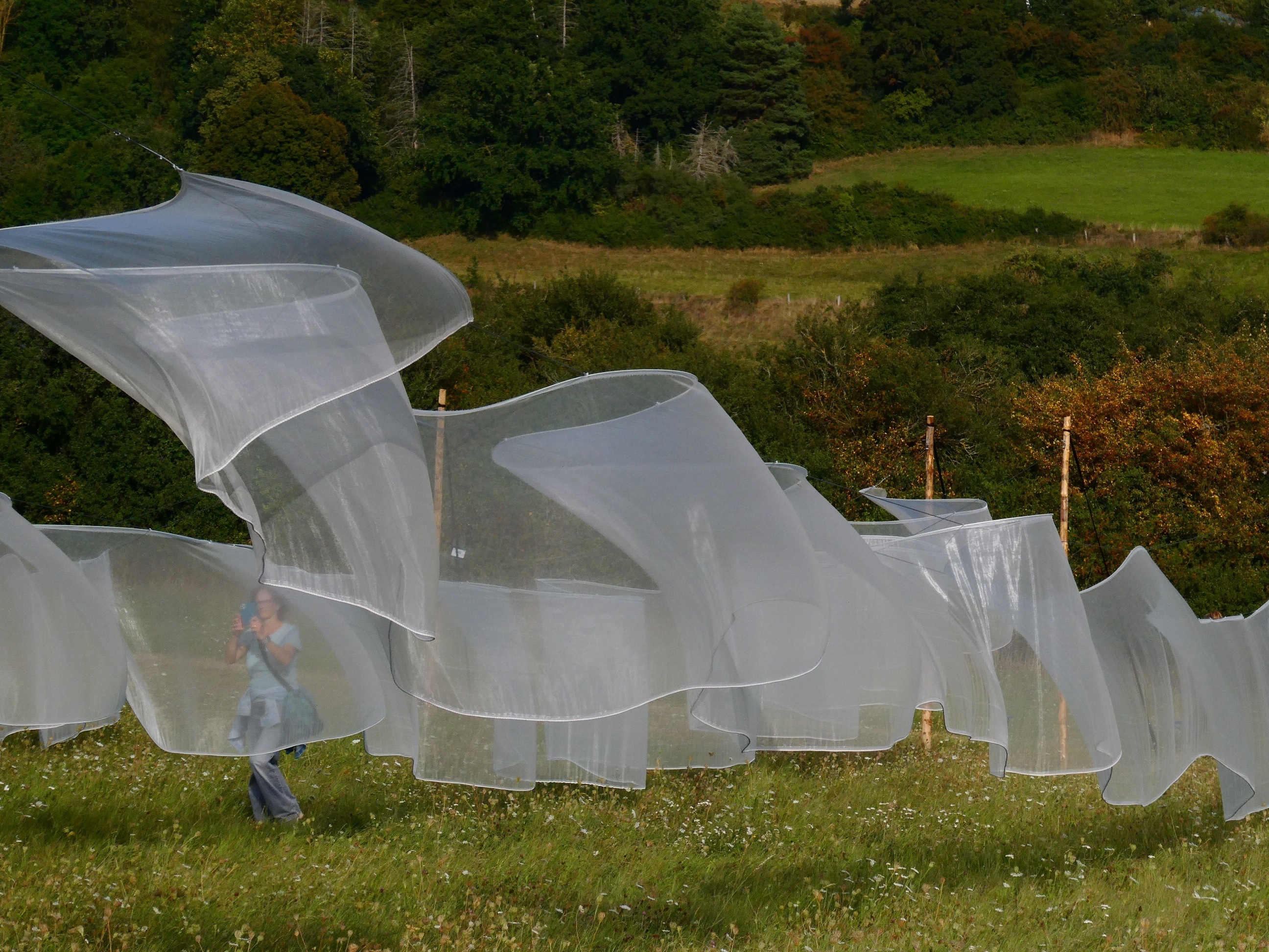 Drei fünfzig Meter lange, weiß glänzende Stoffbahnen sind in Dreiecken in die Landschaft gespannt und dem Wind und dem Licht ausgesetzt.