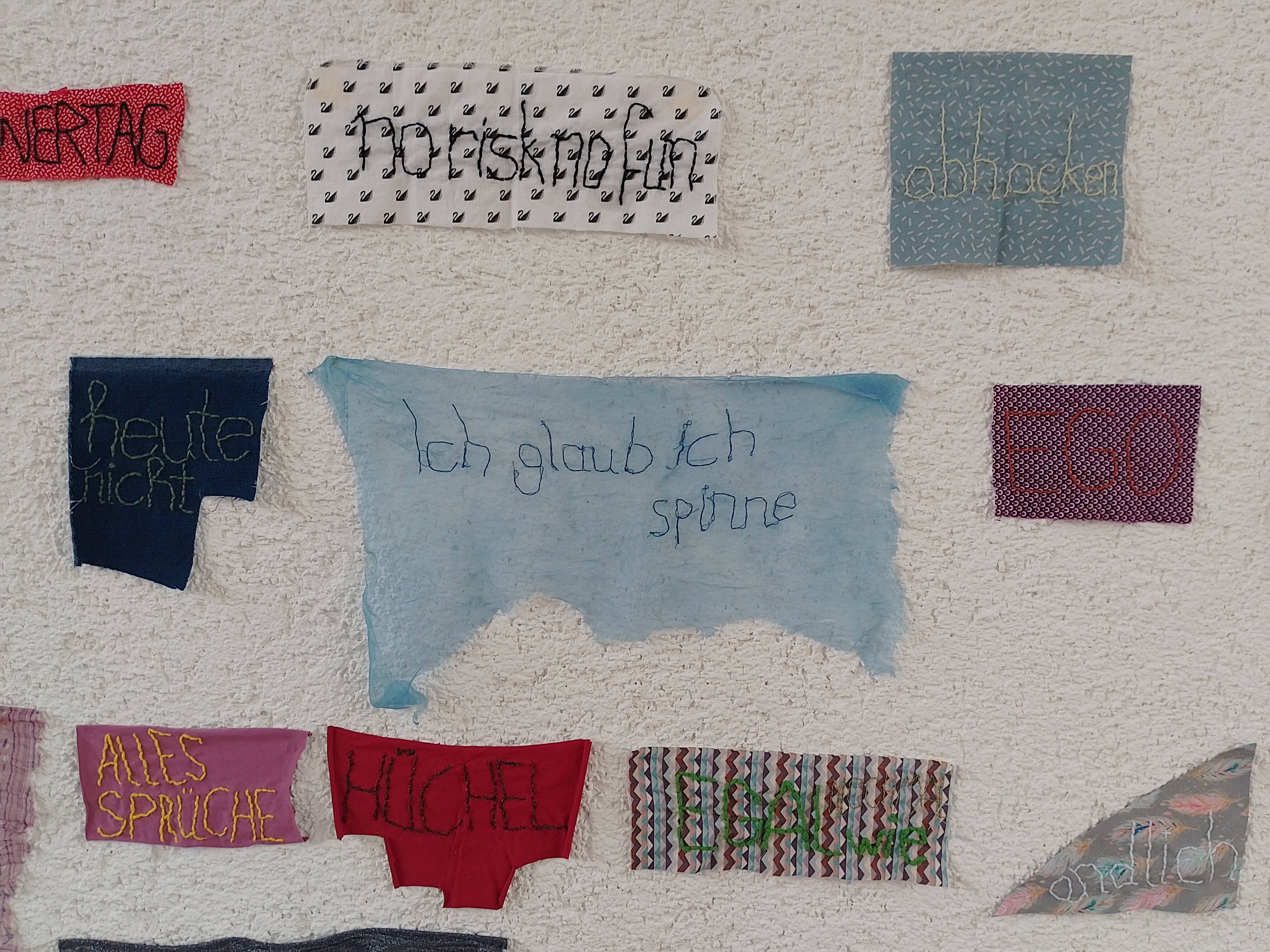 Stoffe, Nadeln und Faden bitte selbst mitbringen. Kollektives sticken/sticheln, Wortspiele und Wertvolles, Grüße und gute Worte, mit einem kleinen individuellen Wortfindungscoaching für alle TN.