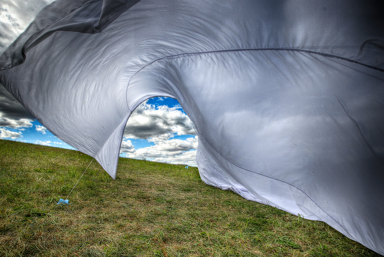 An archway holds a long white piece of fabric and is exposed to the wind. You can walk through the ‘House of Wind’ when the wind is blowing. Without wind, it is closed.