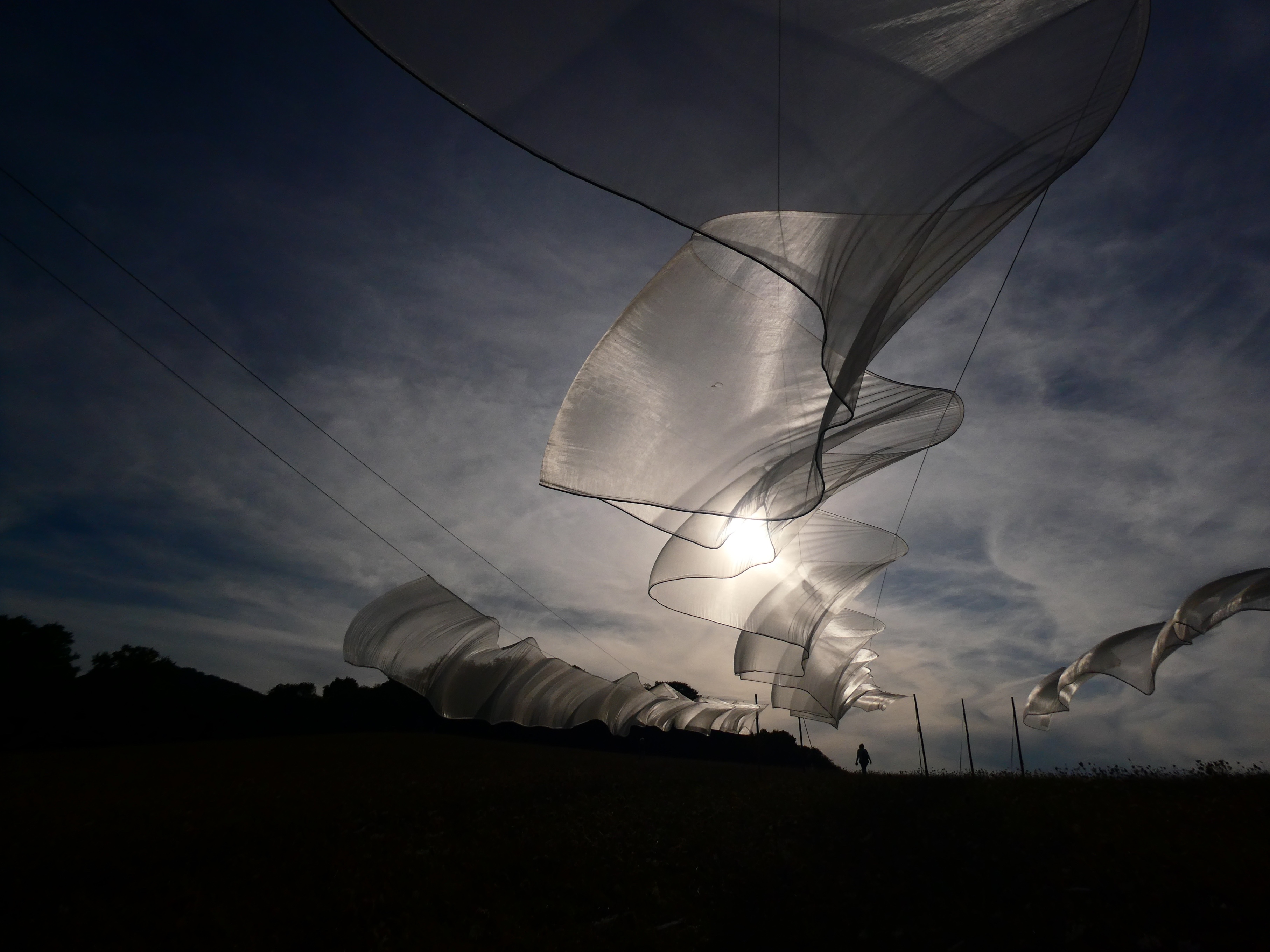 Three fifty-metre-long, shiny white fabric panels are stretched across the landscape in triangles and exposed to the wind and light.