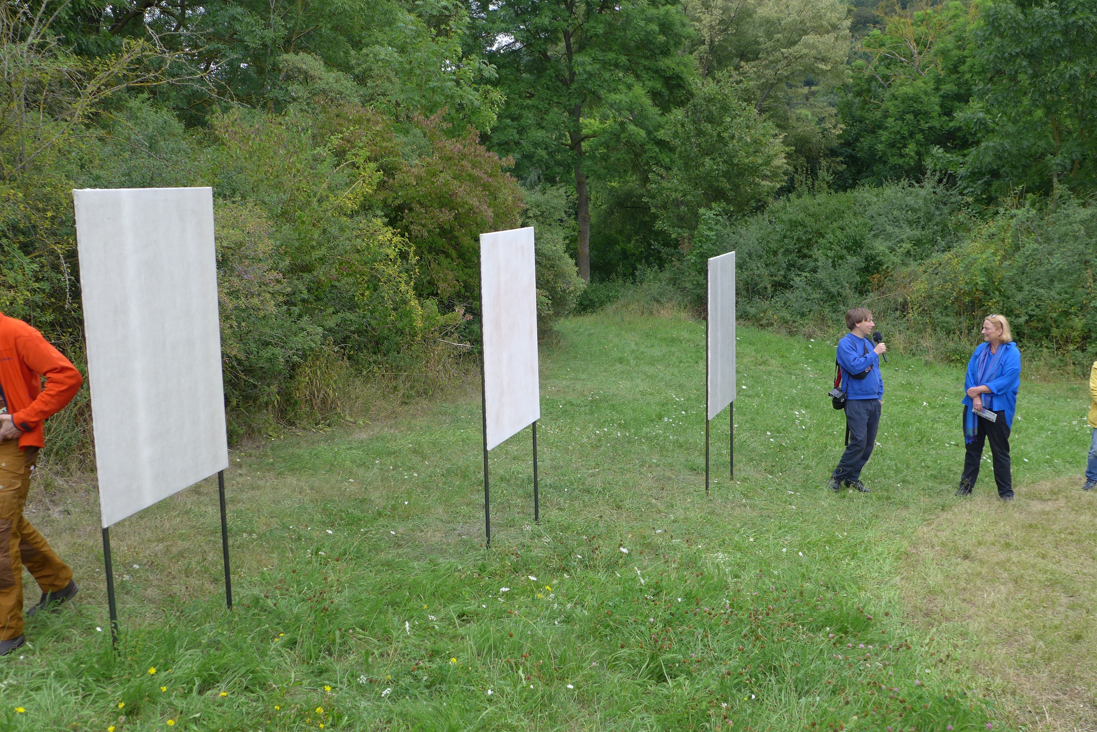 „Die Vielschichtigkeit seiner Arbeit hat uns besonders begeistert. Aus der Distanz wird zunächst nur der Gedanke der Aufforstung sichtbar. Überzeugend durch die skulpturale Reihung / Struktur. Einige Stelen wirken so, als hätten sie oben einen farbigen Abschluß. Der Betrachter ist angelockt näher zu kommen, eine Neugier in der Auseinandersetzung mit der Arbeit. Erst da wird klar, daß es sich nur um Hüllen handelt. Zunächst wird die Farbigkeit des Inneren erkennbar und erst im Moment des Hineinschauens wird die Vielfalt tatsächlich sichtbar: Wahlplakate zeigen Gesellschaftliches, Politisches, die Bewahrung der Demokratie – Beschützen eines zarten Pflänzchens. Bewegung, die nicht sichtbar ist, die aber in den Köpfen umgesetzt wird.“