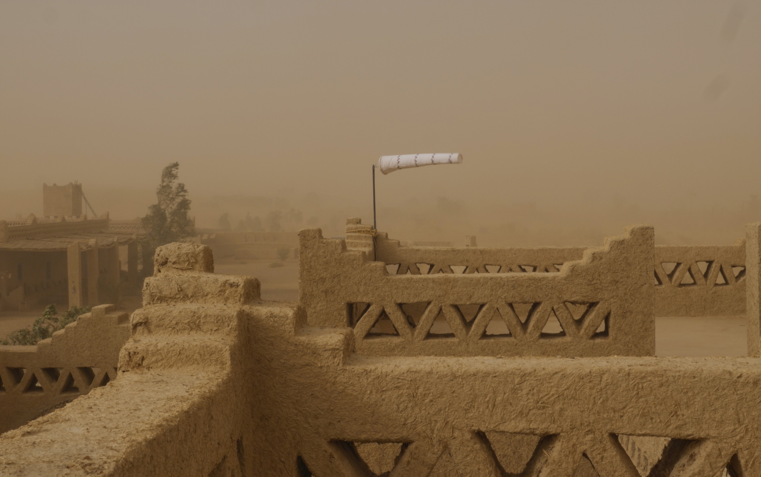 Das Video zeigt einen fiktiven Wetterbericht über die Wetterentwicklung in der marokkanischen Wüste. Die Meteorologin greift ein und verändert mit Reglern Windstärke, Windgeheul und Staubanteil.