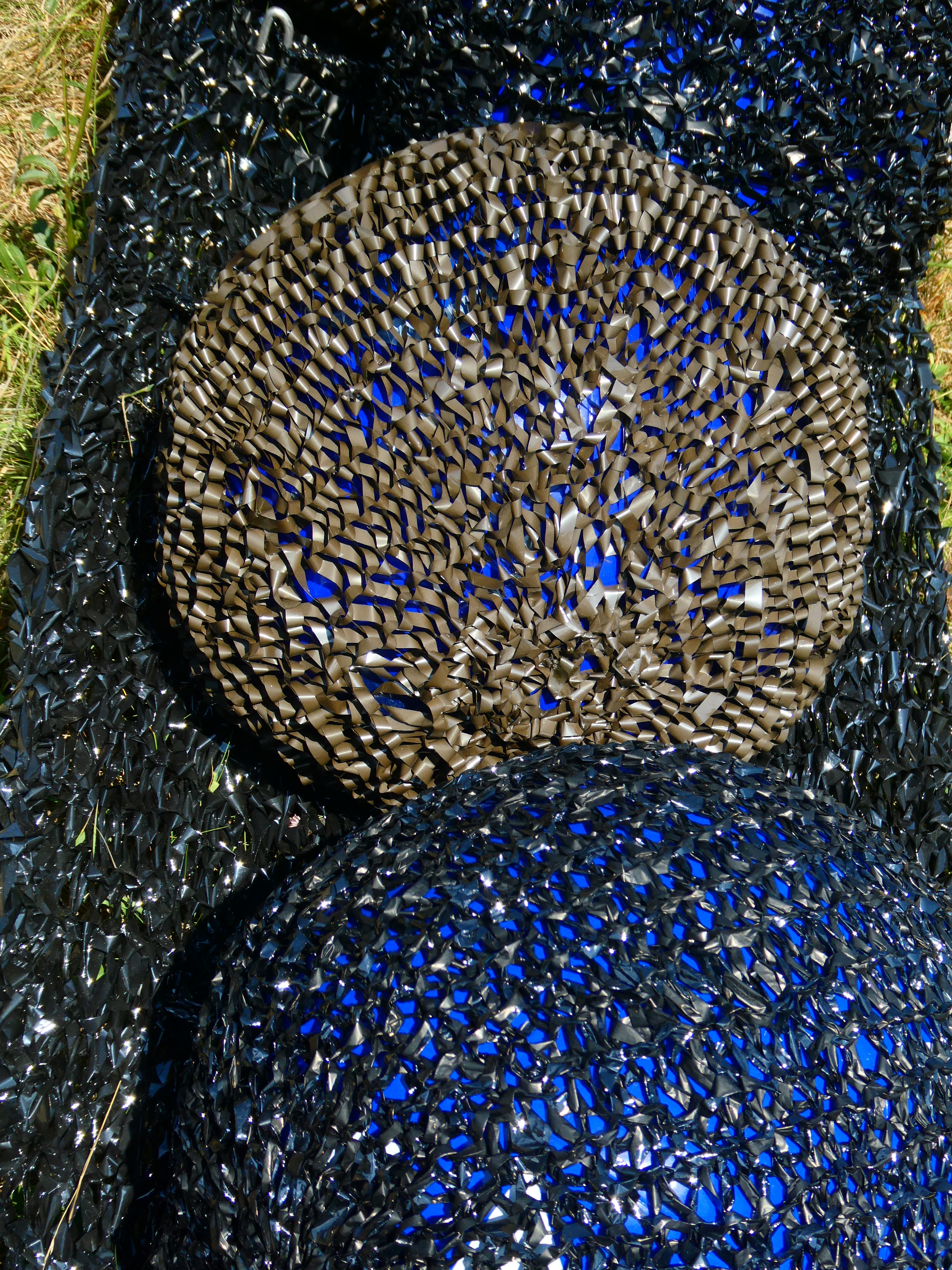 A huge black hammock crocheted from video tapes and magnetic tapes from a NATO project. In the hammock are balls of various sizes, also crocheted.